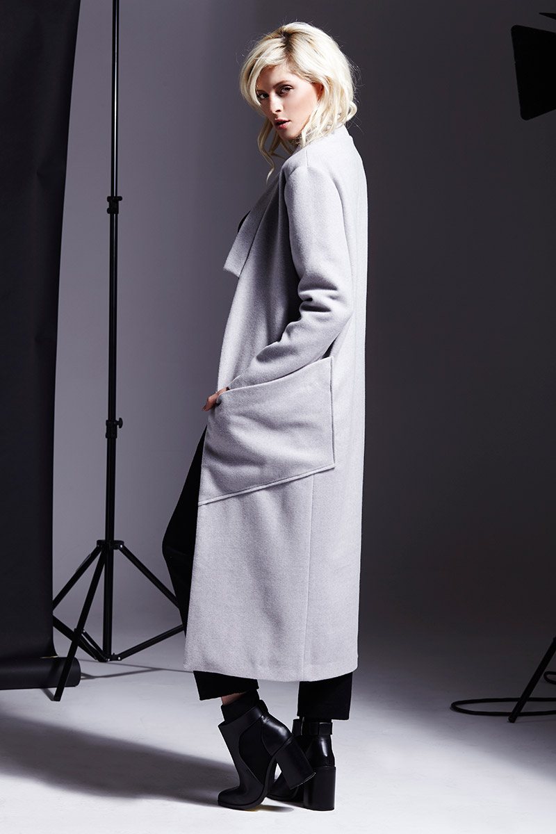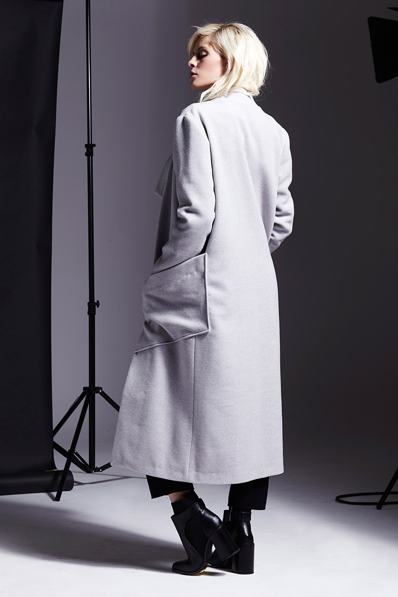 A timeless jacket made of high-quality light grey wool, which makes it soft and comfortable. Comfortable and classic overcoat will match with many outfits. The original collar and spacious pockets add character. There is a possibility to make this model to measure.
