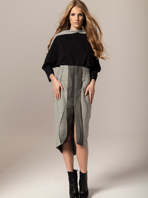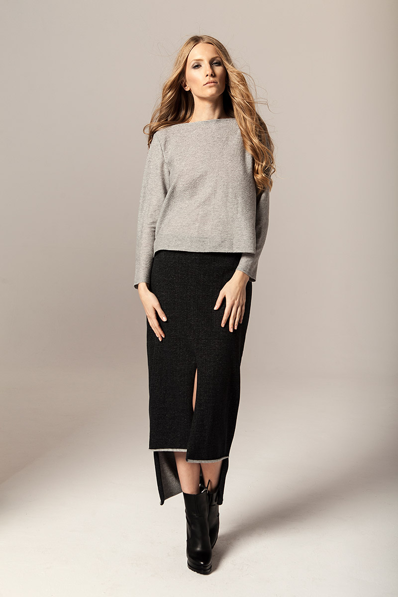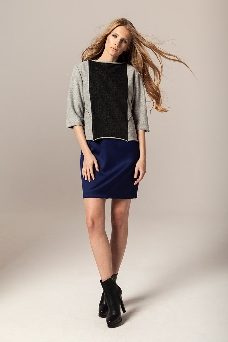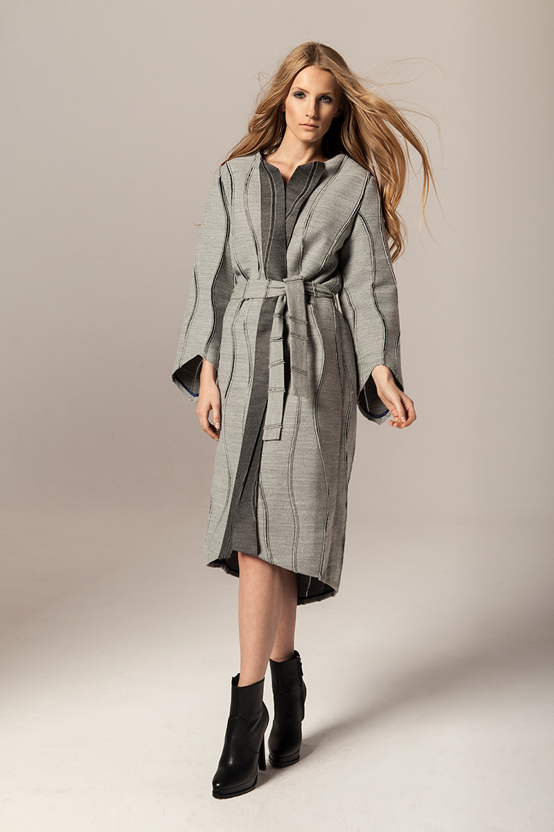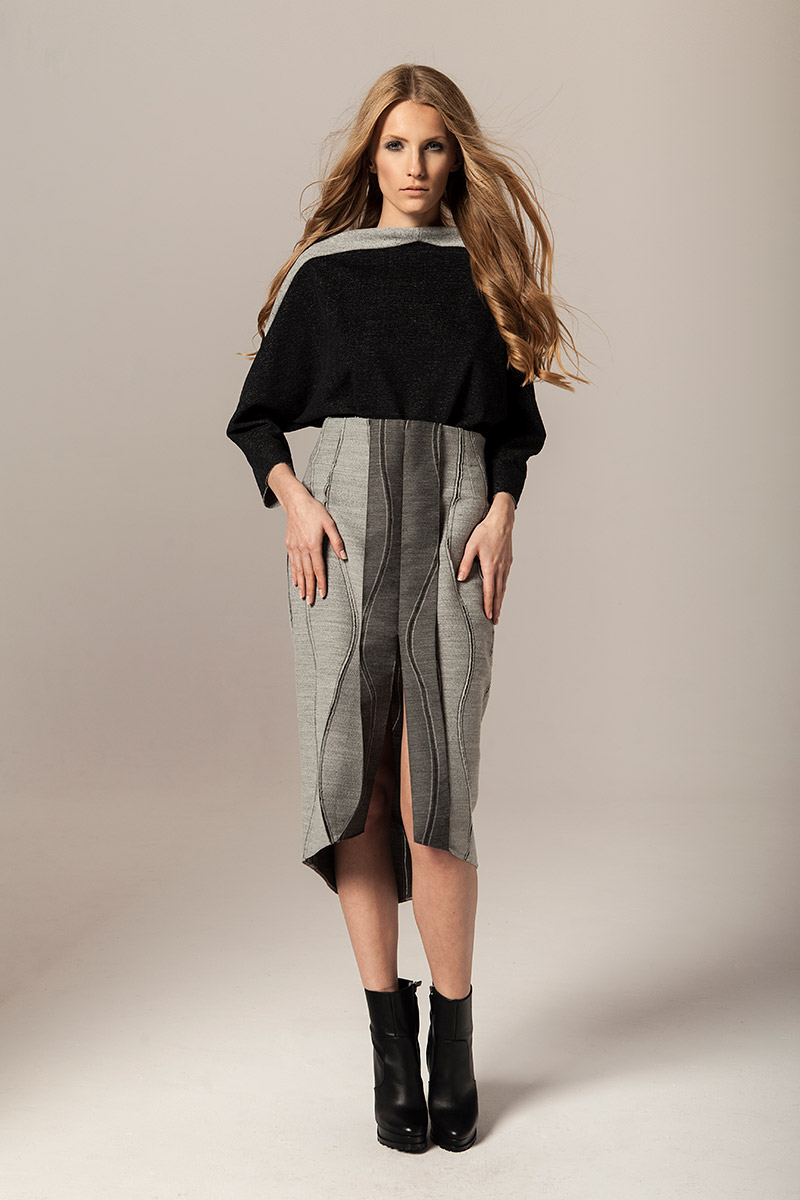Czysty kobalt jest lśniącym, szarosrebrzystym metalem. Błękit kobaltowy, ze względu na swoją trwałość był niegdyś używany jako barwnik przy tworzeniu obrazów. Takie też mają być ubrania Joanna Jachowicz, trwałe, ponadczasowe z nutą nowoczesności. W najnowszej kolekcji pojawiają się tkaniny w odcieniach szarości oraz atramentu – barwy pierwiastka kobaltu. Komfort, piękno i elegancja oraz wysoka jakość tkanin to założenia towarzyszące tworzeniu każdej kolekcji Joanny Jachowicz. Inspiracją do powstania najnowszej kolekcji była potrzeba poszukiwania porządku i równowagi, dokładność niczym w eksperymentach chemicznych, która odzwierciedlona została w postaci symetrycznych cięć, prostych linii, wykonanych z matematyczną precyzją. Geometryczne formy są przejawem dążenia do perfekcji. Kontrastem dla tych działań są elementy kolekcji wykonane z grafitowej dzianiny, która została pozostawiona w swojej surowej formie dzięki nie wykończonym szwom. Proste kształty współgrają z kobiecym ciałem, otulają je ciepłą wełną, delikatną i wygodną dzianiną, przyciągając spojrzenia jak magnes.